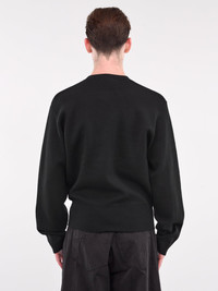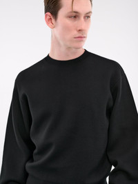 OMAR AFRIDI sweater in black, paneled wool construction, ribbed crewneck, long sleeves, rib-knit cuffs & hem, straight hem, relaxed fit. Made in China 100% Wool European Sizing Model is 6’0” wearing size 48. Shoulders: 19" Chest: 38” Waist: 30”