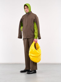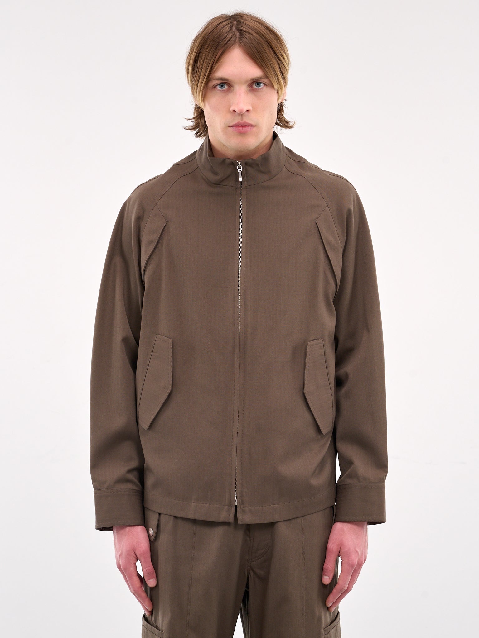 OMAR AFRIDI jacket in brown, paneled construction, stand collar, front concealed zip closure, raglan long sleeves, button cuffs, shoulder armscyes & flaps, side buttoned flap pockets, straight hem, relaxed fit. Italian Sizing Model is 6'1.5" wearing size 48. Shoulders: 18.5" Chest: 37" Waist: 31"