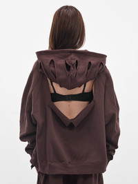 A brown deconstructed hoodie with raw hems and distressed cut-outs. Dropped shoulders, a kangaroo pocket, and elasticated trims frame the oversized silhouette. Featuring: • Oversized fit • Deconstructed design • Raw hems and distressing throughout • Hood • Cut-outs at front and back • Long sleeves • Elasticated cuffs and hem • Front kangaroo pocket • Made in Greece • 100% Organic cotton • Standard sizing Model is 5'7" wearing size S. Bust: 30" Waist: 22" Hips: 33"