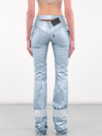 OTTOLINGER pants in blue, paneled stretch poly construction, coated, deconstructed waistband, belt loops, back logo patch, back cut-out, side pockets, back patch pockets & logo flag, calf cuff detailing, flared leg, slim fit. Made in Turkiye 90.5% Recycled Polyester 9.5% Elastane Standard Sizing Model is 5'8" wearing size S. Bust: 31" Waist: 23.5" Hips: 34"