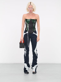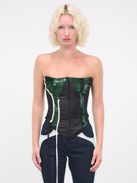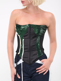 OTTOLINGER green & black corset, deconstructed design, mixed-material construction, sequined & rib knit paneling, strapless, front hook & eye closure, angled dip hem, extended trim, fitted. Made in Greece 70% Polyester 22% Viscose 7% Polyamide 1% Elastane Standard Sizing Model is 5'9" wearing size XS. Bust: 32" Waist: 24" Hips: 34"