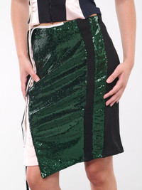 OTTOLINGER green & black skirt, deconstructed design, mixed-material construction, mid-rise, sequined & rib knit paneling, side hook & eye closure, asymmetric hem, extended trim, pencil cut, above-knee length, fitted. Made in Greece 100% Polyester Standard Sizing Model is 5'9" wearing size XS. Bust: 32" Waist: 24" Hips: 34"