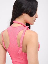 OTTOLINGER top in pink, asymmetric tank top design, layered metalized nylon construction, extended trim self-tie halterneck, rounded neck, sleeveless, armscyes, racerback, one spaghetti strap, straight hem, slim fit. Made in Greece 74% Polyamide 23% Metalized Fiber 3% Elastane Standard Sizing Model is 5'8" wearing size XS. Bust: 32" Waist: 26" Hips: 34.5"