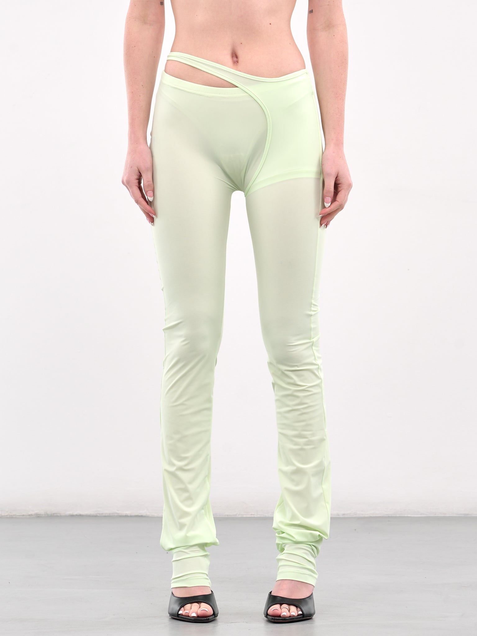 OTTOLINGER leggings in green, paneled construction, high waist, layered waistband, hip cut-out, back logo print, elongated leg, slim fit. Standard Sizing Model is 5'6" wearing size S. Bust: 32" Waist: 23" Hips: 35"
