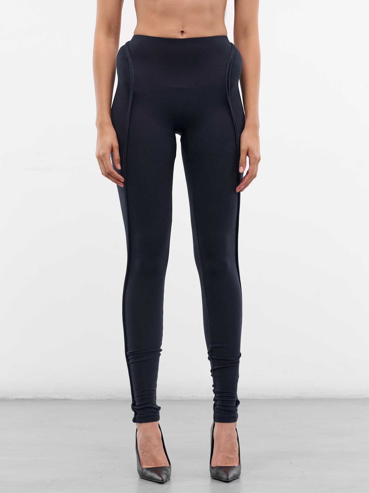 Navy cotton leggings with padded hips and spiral piping. The high-waisted fit and skinny leg emphasize a sleek, contoured silhouette. Featuring: • Slim fit • Cotton construction • High waist with elasticated waistband • Hip padding • Spiral piping • Skinny leg • Made from 97% Organic Cotton 3% Elastane • Standard sizing Model is 5'8" wearing size S. Bust: 32" Waist: 26" Hips: 34.5"