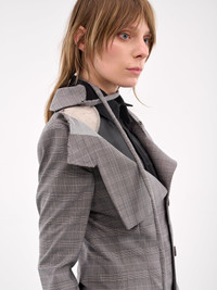OTTOLINGER blazer in grey, poly-wool blend, paneled construction, plaid pattern, deconstructed detailing throughout, wrap-around neck, deconstructed notched lapel, off-shoulder style, long sleeves, cuff vents, front button closure, side welted flap pockets, back vents, straight hem, tailored fit. Made in Greece 54% Polyester 44% Wool 2% Elastane French Sizing Model is 5'5" wearing size 36. Bust: 32" Waist: 25" Hips: 33"