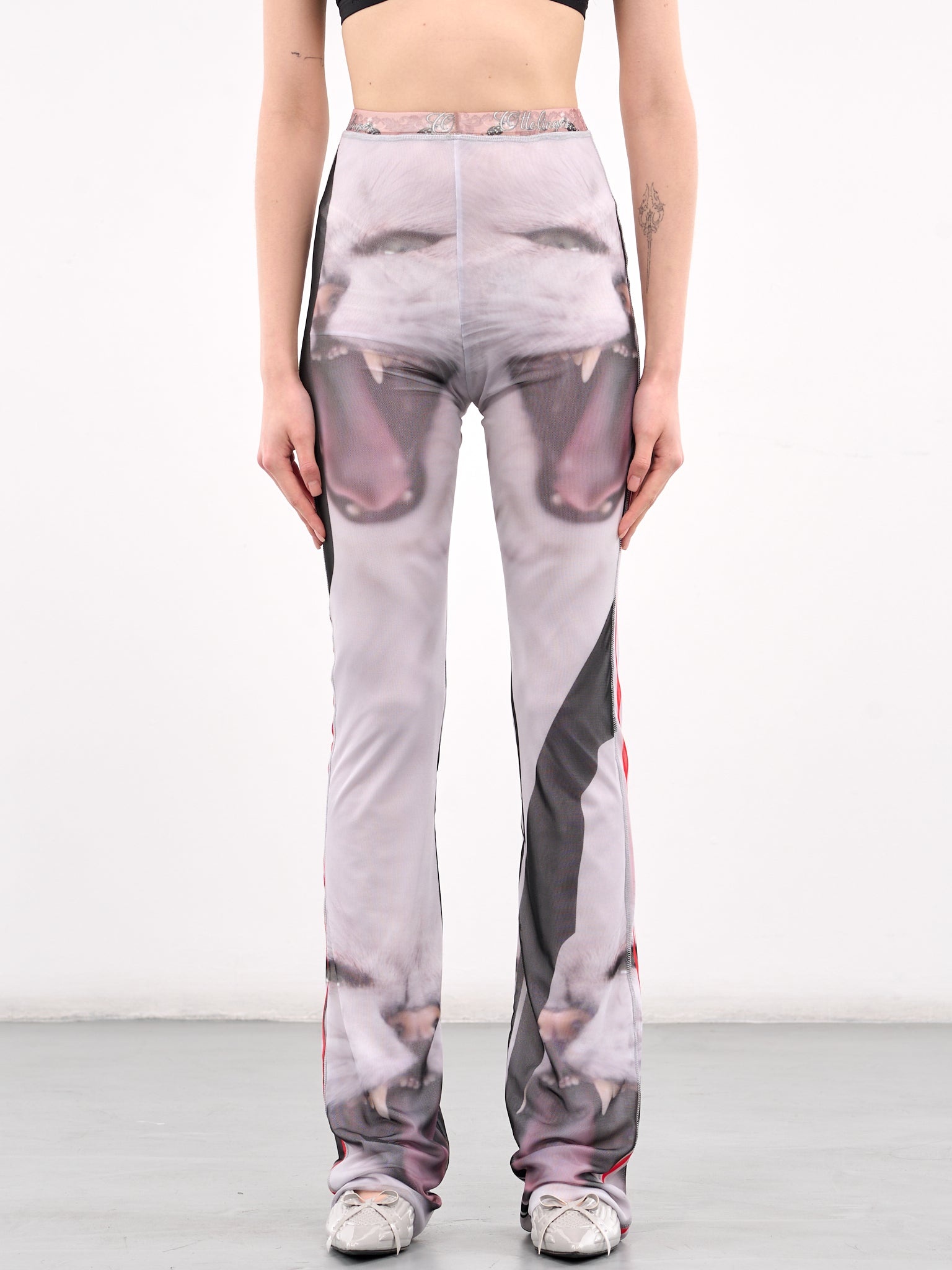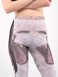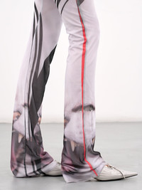 OTTOLINGER trousers in white, paneled mesh construction, semi-sheer, printed logo & graphics, high waist, fitted waistband, elongated leg, slim fit. Made in Greece 90% Recycled Polyester 10% Elastane Standard Sizing Model is 5'8" wearing size S. Bust: 28.5" Waist: 22.5" Hips: 33.5"