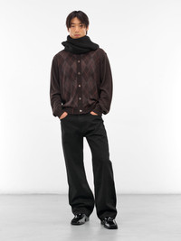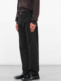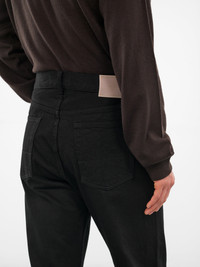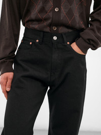 Black selvedge Third Cut jeans in pigment-dyed Italian denim with a relaxed, wide-legged profile and reinforced back pockets for durable, workwear-inflected structure. Featuring: • Relaxed fit • Wide straight leg • Pigment dyed Italian selvedge denim • YKK zip fly • Metal rivets • Five pockets • Reinforced back pockets • Our Legacy rubber patch • Main: 100% Cotton • Standard sizing Model is 6'1" wearing size 30. Shoulders: 18" Chest: 36" Waist: 28"