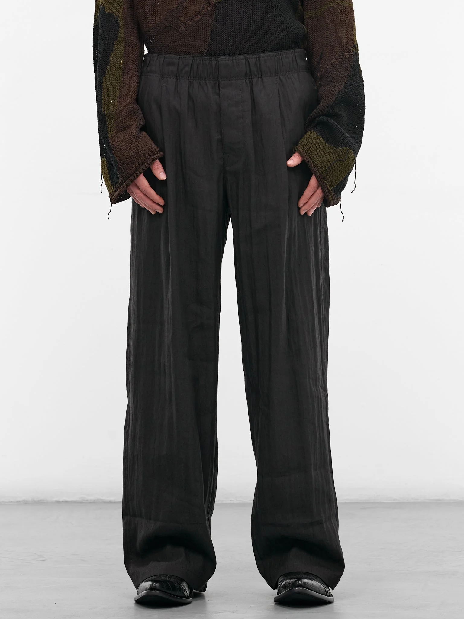 Leisure trousers in soot black constructed in a linen and nylon blend with elasticated waist and pleating. Featuring: • Relaxed fit • Wide leg • Piece-dyed • Elasticated waist • Pleated • Concealed button fly • Corozo buttons • Side pockets and back patch pocket • 65% Linen 35% Polyamide • Italian sizing Model is 6'0" wearing size 48. Shoulders: 19" Chest: 35" Waist: 28"