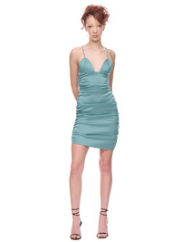 PARIS GEORGIA dress in teal, rouched design, sweetheart neckline, spaghetti straps, double layered bra with tonal topstitching, side zip fastening, mini length, form fitting. Made in New Zealand Standard Sizing 80% Triacetate, 20% Polyester Model is 5'9.5" wearing size XXS. Bust: 32" Waist: 26" Hip: 35"