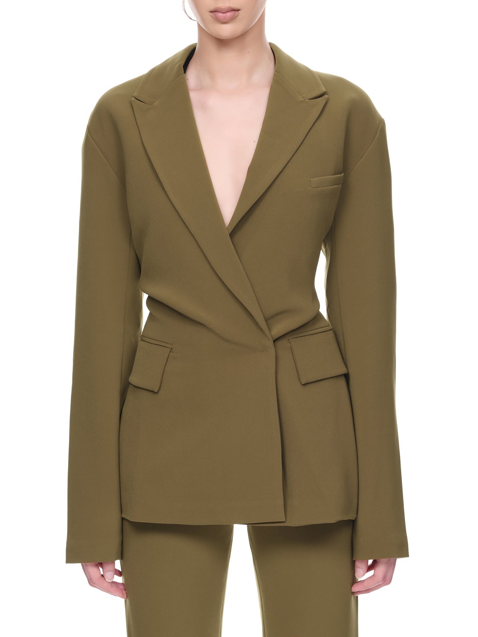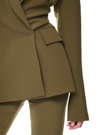 PARIS GEORGIA jacket in khaki green, sculpted silhouette, cinched waist, lapel collar, double breasted, hook eye closure, chest pocket, side flap pockets, drop shoulder, elongated sleeves, tailored relaxed fit. Standard Sizing 95% Polyester, 5% Spandex Model is 5'9.5" wearing size XXS. Bust: 32" Waist: 26" Hip: 35"