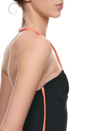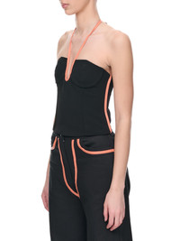 PARIS GEORGIA top in black, denim & vegan leather, halter neckline, sleeveless, tonal topstitching, contrast piping, waist length, slim fit. Standard Sizing Main - 63% Triacetate, 37% Polyester Second - 60% Polyurethane, 40% Polyester Model is 5'9.5" wearing size XXS. Bust: 32" Waist: 26" Hip: 35"