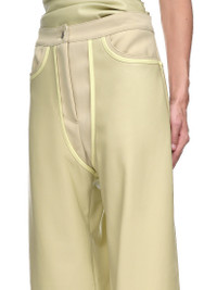 Paris Georgia cowboy trousers in mist lime. Bonded stretch & vegan leather binding detail, button closure, front pockets, low rise, wide leg. Made in New Zealand Standard Sizing Composition: Vegan Leather Model is 5ft 8” and is wearing a size XS. Bust: 33” Waist: 24” Hip: 34"
