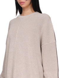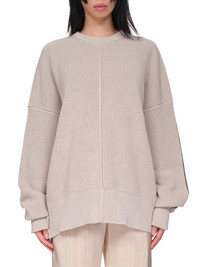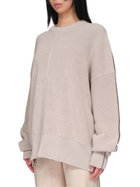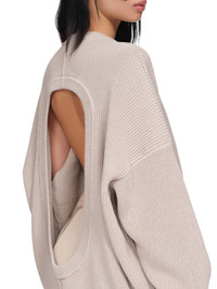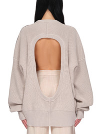 Peter Do knit sweater in latte, crew neck, long sleeves, oversized silhouette, large cutout at back. Made in Italy. Standard Sizing. Composition: 100% Cotton. Model is 5'10" and is wearing a size S. Bust: 30" Waist: 23" Hip: 34"