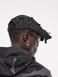 POST ARCHIVE FACTION hat in black, technical construction, laser-cut organic pattern, water-resistant, adjustable webbing strap & buckle, snap-button fastening, adjustable fit. Made in Korea Fabric 1: 95% Nylon 5% Elastane Fabric 2: 100% Polyester One Size
