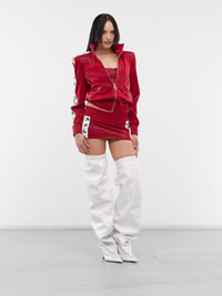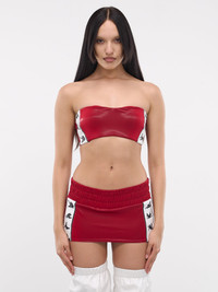 POSTER GIRL tube top in red, paneled mixed-material construction, glossy finish, sweetheart neckline, strapless, side graphic tape detailing, straight hem, cropped length, slim fit. Made in Bulgaria 70% Polyester 25% Polyurethane 5% Elastane Standard Sizing Model is 5'8" wearing size XS. Bust: 32" Waist: 26" Hips: 34.5"