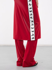 POSTER GIRL skirt in red, hybrid trouser skirt design, paneled mixed-material construction, glossy finish, low waist, elasticated waistband, side graphic tape detailing, straight hem, midi skirt length, straight leg trouser underlay, slim fit. Made in Bulgaria 70% Polyester 25% Polyurethane 5% Elastane Standard Sizing Model is 5'8" wearing size S. Bust: 32" Waist: 26" Hips: 34.5"