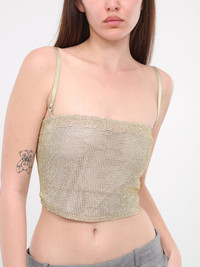 POSTER GIRL top in yellow, chainmail top design, paneled chainmail construction, rhinestone-encrusted, straight neckline, adjustable spaghetti straps, sleeveless, armscyes, open back, back bungee drawstring fastening, straight hem, cropped length, slim fit. Made in London 50% Aluminum 50% Glass Standard Sizing Model is 5'10" wearing size S. Bust: 33" Waist: 24" Hips: 35"