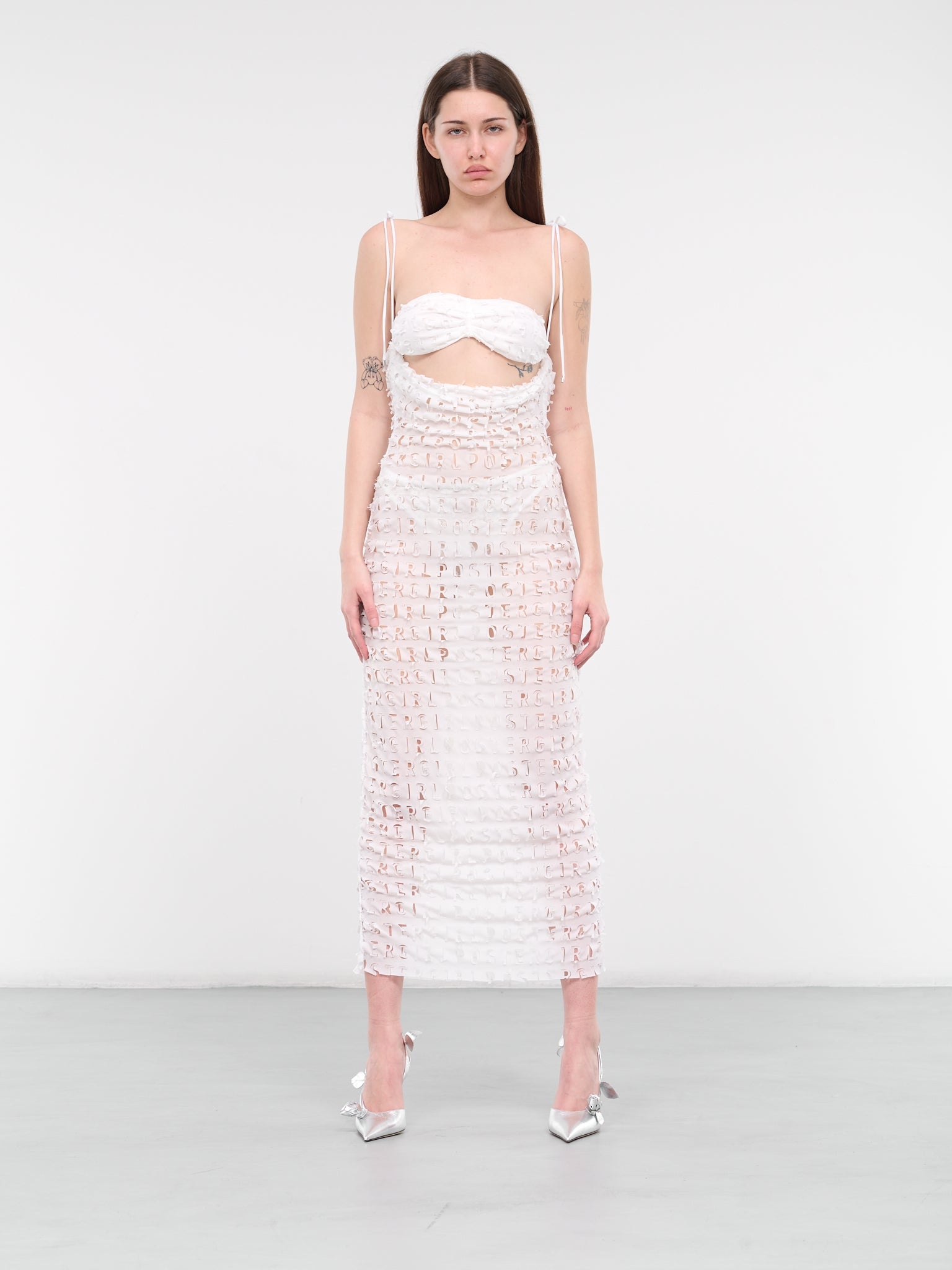 POSTER GIRL dress in white, paneled construction, laser cut-out logo lettering pattern, sweetheart neckline, self-tie spaghetti straps, sleeveless, armscyes, back strap hook-eye closure, open back, front cut-out, straight hem, maxi-length, slim fit. Made in UK 65% Nylon 35% Elastane Standard Sizing Model is 5'10" wearing size XS. Bust: 33" Waist: 24" Hips: 35"
