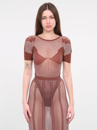 POSTER GIRL bodysuit in brown, shapewear design, paneled stretch nylon construction, leaves pattern, semi-sheer, round neck, short sleeves, high-cut, form fit. Made in Italy 43% Polyester 45% Polyamide 12% Elastane One Size Model is 5'10" wearing size OS. Bust: 33" Waist: 24" Hips: 35"
