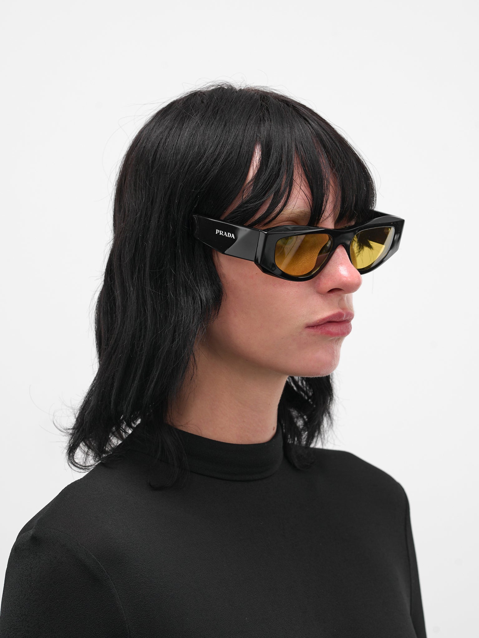 Black acetate sunglasses with a narrow geometric frame featuring beveled angular rims. Three-dimensional temples are finished with an iconographic interpretation of the Prada triangle logo. Featuring: • Acetate frame construction • Narrow geometric front • Clean lines with beveled angular rims • Three-dimensional temples with Prada triangle logo detailing • 100% UVA/UVB protection • Frame not compatible with graduated lenses • Yellow-tinted lenses • Includes dedicated packaging, case, and cloth • Imported • One size