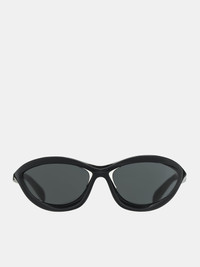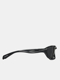 PRADA sunglasses in black & grey, acetate & nylon construction, glossy finish, ovular frames, grey-tinted lenses, bridge lens cut-out, fixed nose pads, temple cut-outs, temple tip logo detailing. Imported Acetate & Nylon One Size