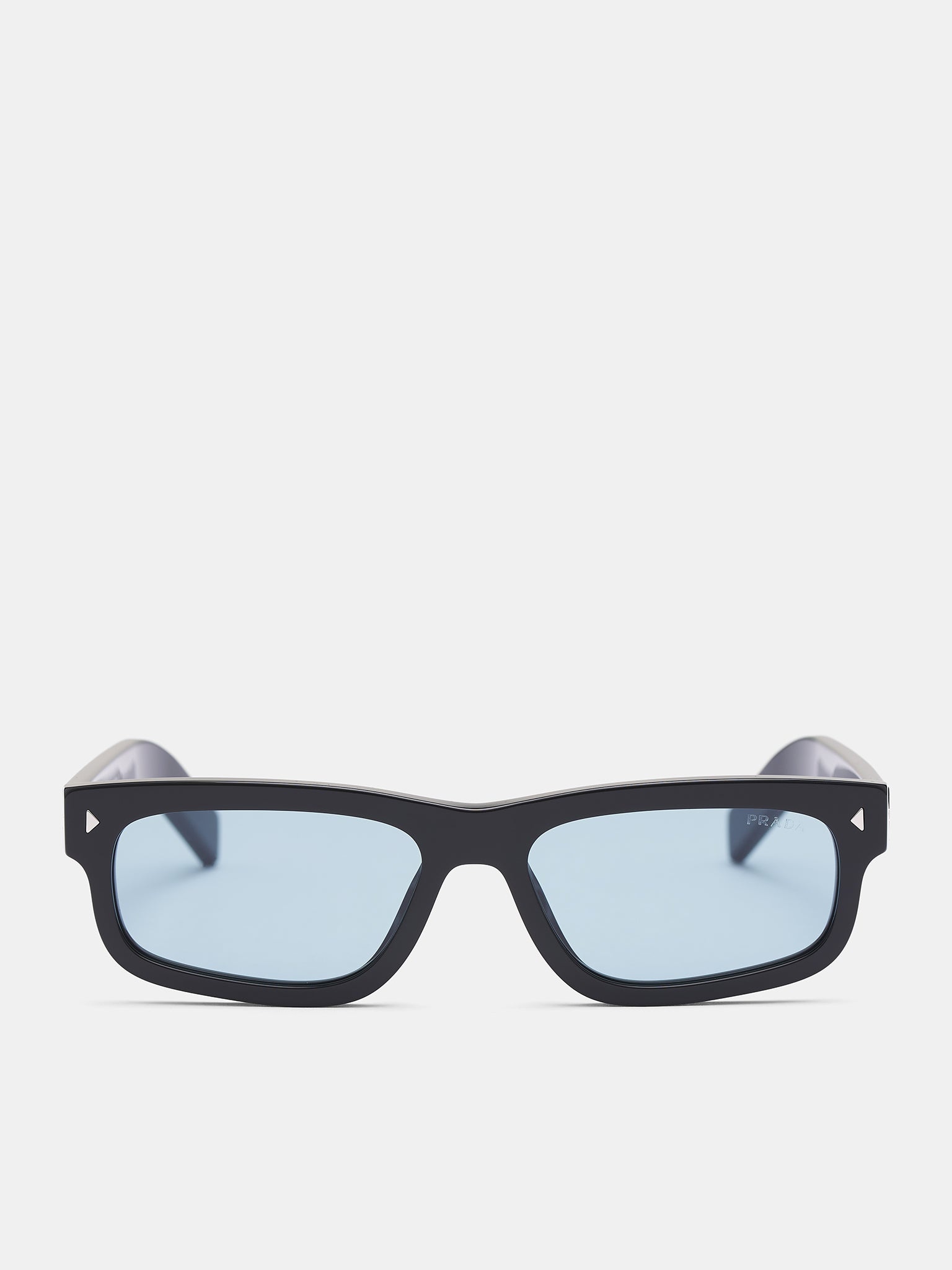 PRADA sunglasses in black & blue, acetate construction, rectangular frames design, glossy finish, blue-tinted lenses, fixed nose pads, temple silver hardware & logo detailing, case included. Imported Acetate One Size