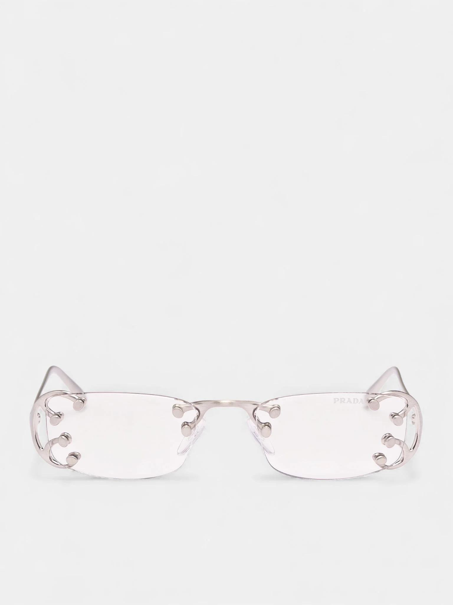 Rectangular frame sunglasses in metal with rimless design and rivet detailing. Featuring: • Rimless design and rivet detailing • Silver-tone hardware • Clear lenses • Cut-outs at temples • Logo detailing at temples • Adjustable nose pads • Case included • 100% Metal • One size