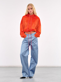 PRISCAVERA jeans in blue, paneled denim construction, belt loops, back logo patch, front button & concealed zip fly closure, inset pockets, coin pocket, back patch pockets, raw hems, wide leg, loose fit. Standard Sizing Model is 5'8.5" wearing size S. Bust: 32" Waist: 24" Hips: 34"