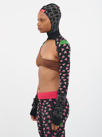 PROTOTYPES sleeves in black, paneled hooded design, stretch knit construction, deadstock fabric, cat pattern, exposed seams, back signature barcode label, fitted. One Size Model is 5'7" wearing size OS. Bust: 32" Waist: 24" Hips: 34"