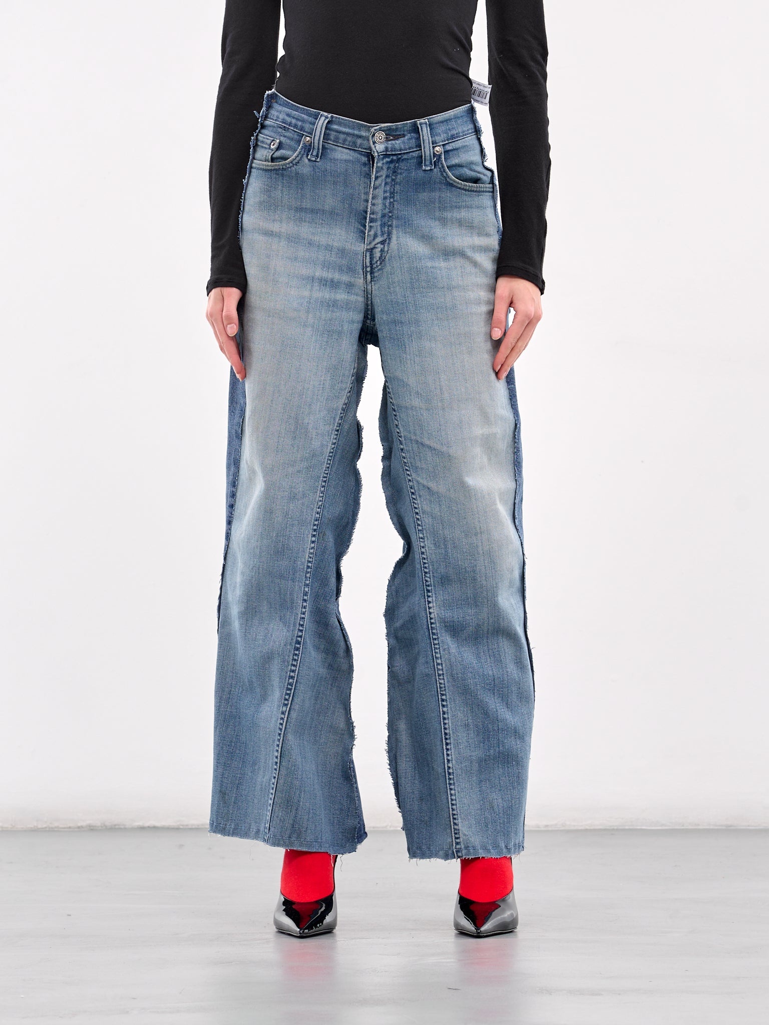 PROTOTYPES jeans in blue, paneled denim construction, raw hems & deconstructed detailing, fading, belt loops, front button & concealed zip fly closure, inset pockets, coin pocket, back patch pockets, back logo tag, wide leg, baggy fit. Made in Italy 100% Cotton Standard Sizing Model is 5'8" wearing size XS. Bust: 32" Waist: 24" Hips: 35"