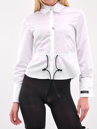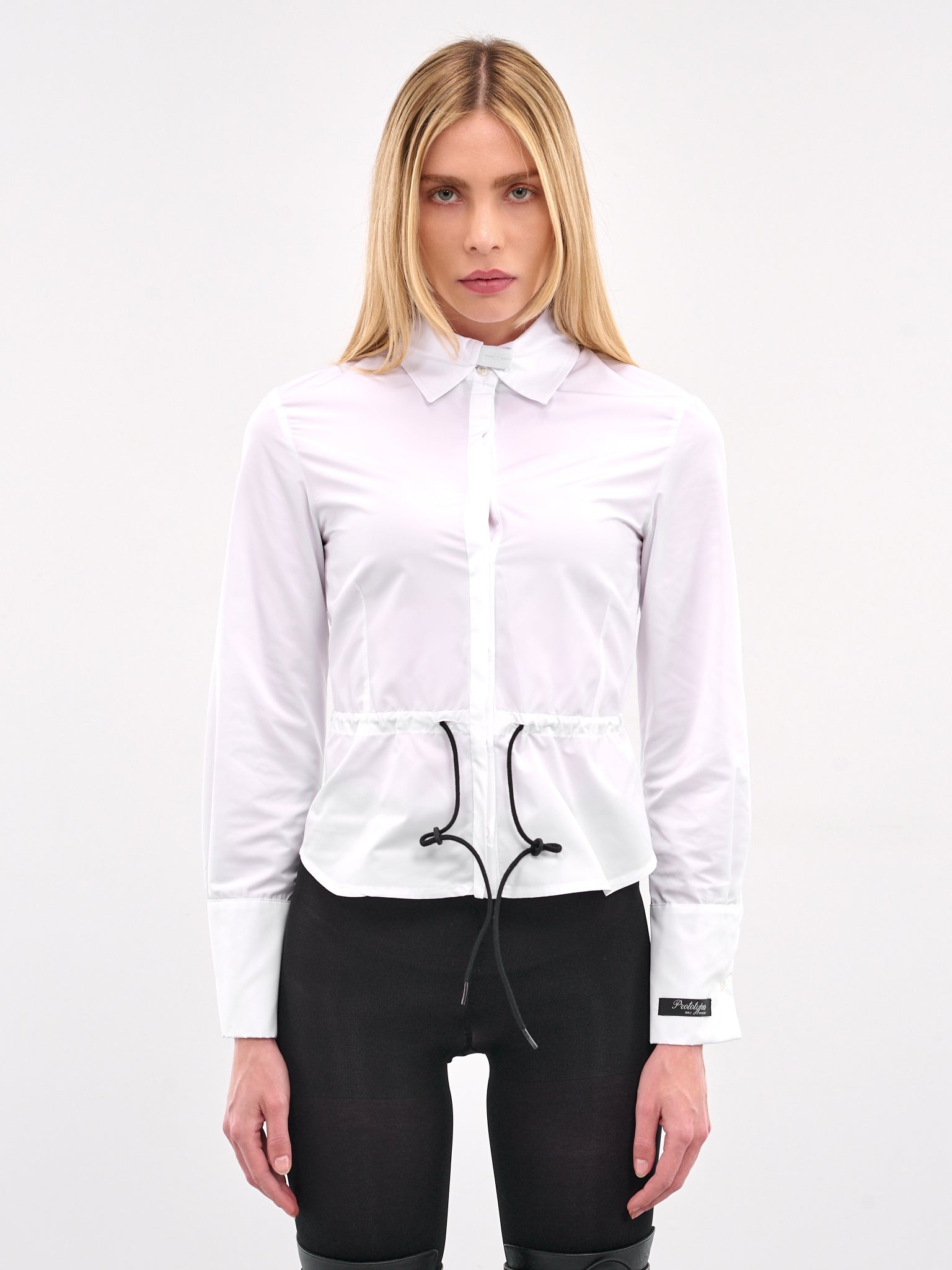 PROTOTYPES shirt in white, paneled nylon construction, spread collar, front concealed button placket closure, long sleeves, button cuffs, cuff logo patch, back signature tag, bodice darting, adjustable drawstring waist, curved hem, slim fit. Made in Italy 100% Nylon Standard Sizing Model is 5'8" wearing size XS. Bust: 32" Waist: 24" Hips: 35"
