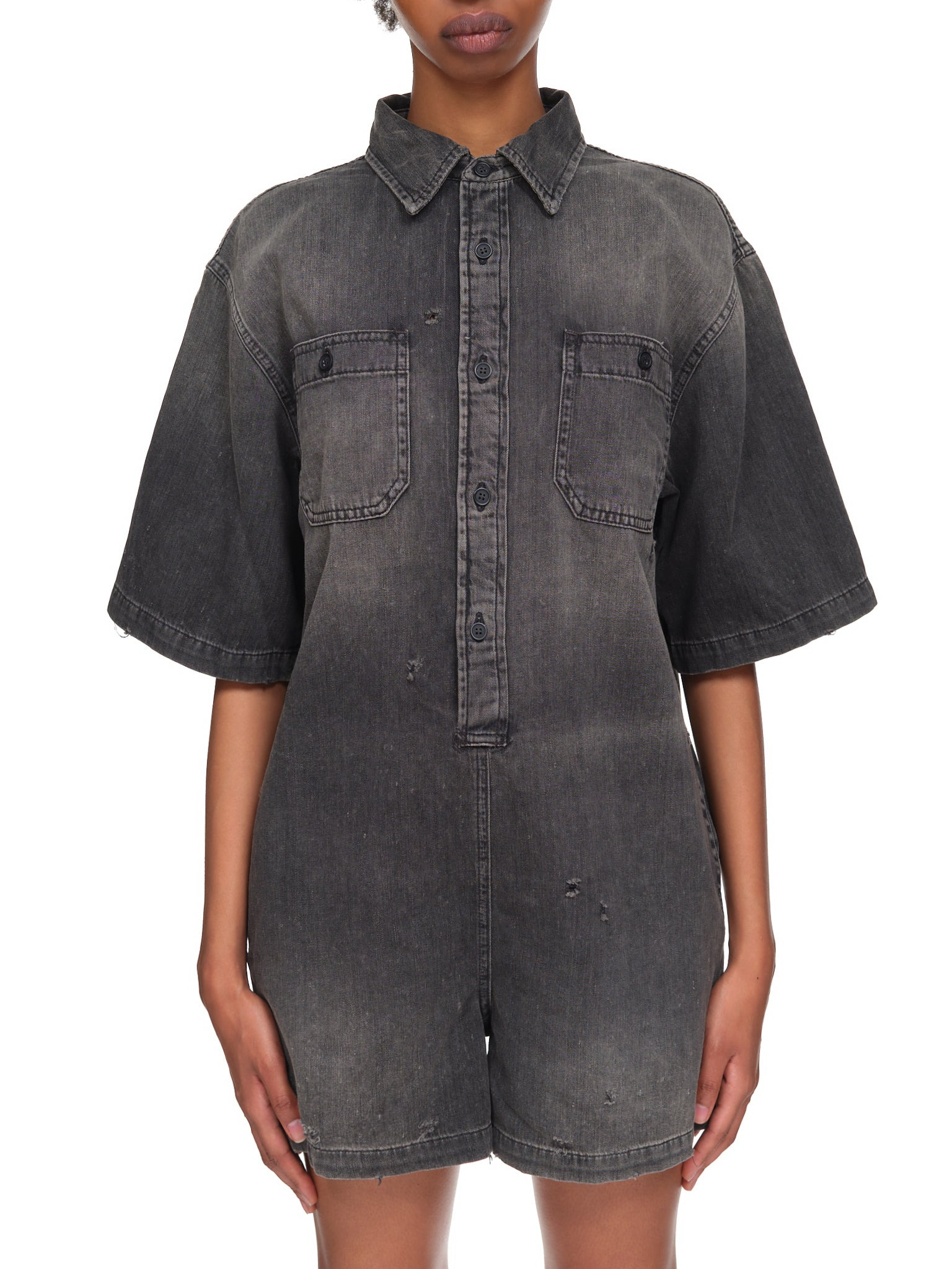 R-13 jumpsuit in gray denim, lapel collar, tonal front button closure, above-elbow sleeves, breast pockets, silt hand pockets. Made in Japan. Standard Sizing. Composition: 100% Cotton. Model is 5ft 8” and wearing a size S. Bust: 32” Waist: 25” Hip: 35"