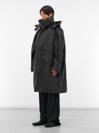 Black coat in nylon with oversized mid-length volume, a high neck, a hood, and a concealed zip placket. Featuring: • Oversized fit • High neck with hood • Button fastening • Front concealed zip placket closure • Storm flap • Straps at cuffs • Side flap pockets • Mid-length • Made in China • Main: 100% Nylon | Part: 90% Polyester 10% Polyurethane • One size Model is 6'1" wearing size OS. Shoulders: 18" Chest: 36" Waist: 28"
