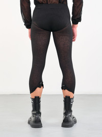 RANDOM IDENTITIES pants in black, leggings design, rib stretch fabric, semi-sheer, mid-elasticized waist, snap-button cuffs, cropped, fitted. Made in Portugal 100% Cotton European Sizing Model is 6’0” wearing size L. Shoulders: 19” Chest: 37” Waist: 30"