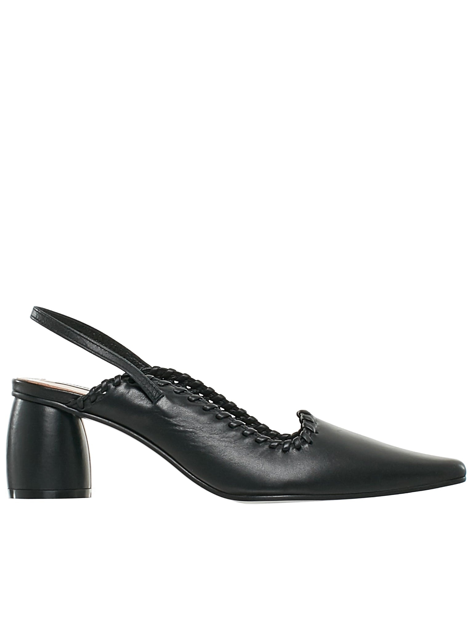 Reike Nen heels in black, leather upper body with rubber sole, elastic slingback strap, woven trim, tonal stitching. Made in Korea. Composition - 100% Leather