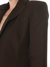 Richard Quinn open blazer in dark brown, floral print lining in blue, peaked lapel, square shoulder, jetted breast pocket, slit sleeve outseam with floral trim, back vent with floral trim, straight hem, and tonal stitching. Composition - 60% Polyester, 40% Viscose Model wears a size S.