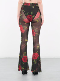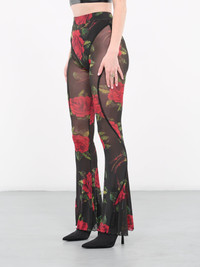 RICHARD QUINN black pants, flared silhouette, sheer mesh, rose print, high-elastic waist, lettuce edge hem, fitted. UK Sizing Model is 5'6" wearing size 8. Bust: 32" Waist: 24" Hips: 35"