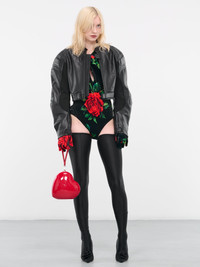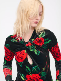 RICHARD QUINN black bodysuit, gloved design, velvet construction, rose print, twisted neckline, inner wrist zip opening, back zip closure, fitted. UK Sizing Model is 5'6" wearing size 10. Bust: 32" Waist: 24" Hips: 35"