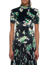 Richard Quinn velour top in black, all-over daisy pattern, high collar, short sleeves, tight fit, back zip closure, straight/finished hem, tonal stitching. Made in England. Composition - 90% Polyester, 10% Spandex Model is 5ft 8” and wearing a size 10. Bust: 32” Waist: 26” Hip: 36"