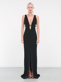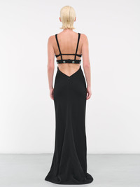 ROBERTO CAVALLI dress in black, turquoise gemstone-embellished spiked hoop, cut-outs, plunging halter neck, open back, maxi length, fitted. Made in Italy Italian Sizing 100% Viscose Model is 5'9" wearing size 40. Bust: 32" Waist: 24" Hips: 34"