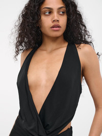 ROBERTO CAVALLI dress in black, floor-sweeping design, slinky jersey, crystal & bead-embellished palm tree brooch, plunging v-neck, sleeveless, cut-out sides, gathered waist, front split, open back, crossover straps, concealed zip closure, maxi length, slim fit. Made in Italy Italian Sizing 100% Viscose Model is 5'7.5" wearing size 40. Bust: 32" Waist: 24" Hips: 34"
