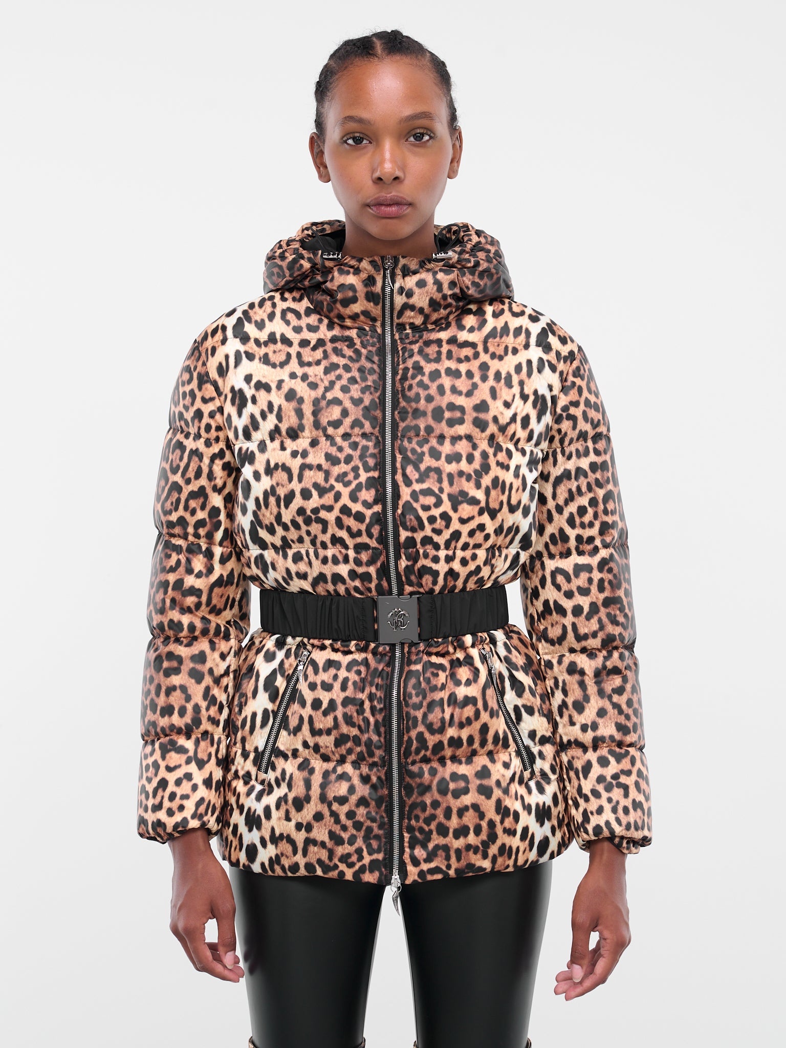 ROBERTO CAVALLI jacket in brown, puffer design, quilted finish, jaguar print, mirror snake motif, hooded collar, adjustable bungee cords, dual-end zip closure, belt loops, detachable chunky belt, side zip pockets, silver-tone hardware, regular fit. Italian Sizing 100% Polyester Model is 5'8" wearing size 40. Bust: 32" Waist: 26" Hips: 34.5"