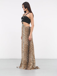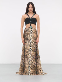 ROBERTO CAVALLI beige and black dress, halter top, leopard-print, open front & back, v-neckline, gemstone-embellished strap, high-waist, draped, floor-length, regular fit. Made in Italy 86% Nylon 14% Elastane European Sizing Model is 5'8" wearing size 42. Bust: 32" Waist: 26" Hips: 34.5"