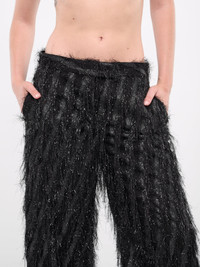 ROBERTO CAVALLI pants in black, paneled lurex construction, hairy texture, metallic appearance, mid-rise, fitted waist, front concealed closure, side pockets, back welt pockets, extended inseam, wide leg, loose fit. Made in Italy Italian Sizing Model is 5'9" wearing size 40. Bust: 32" Waist: 24" Hips: 34"