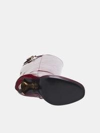 ROBERTO CAVALLI boots in Bordeaux, leather construction, patent finish, knee-high, gold-tone pin-buckle strap, side zip closure, stiletto heels, pointed toe, lined. Made in Italy Leather European Sizing