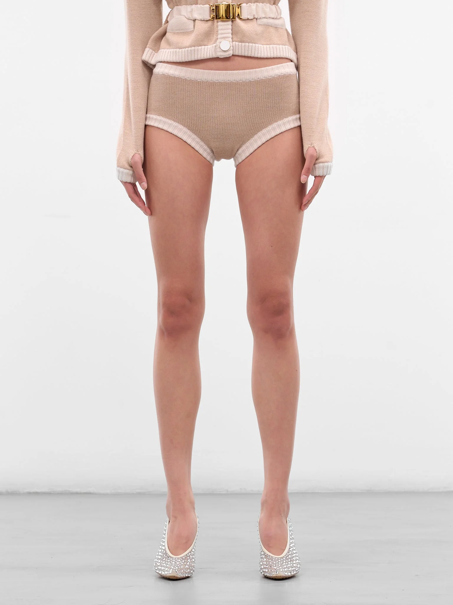 A slim beige virgin wool knit skirt with contrast hems and ribbed waistband in micro length. Featuring: • Slim fit • Wool knit construction • Beige color with contrast hems • Ribbed waistband with angled hems and rib-knitting • Micro length • Made in Italy • 100% Virgin wool • Standard sizing Model is 5'10" wearing size S. Bust: 31” Waist: 22” Hips: 33”