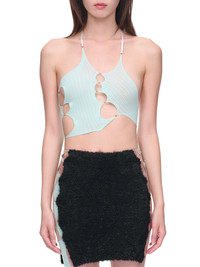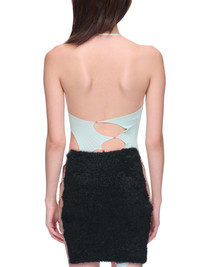 RUI bodysuit in light blue, halter-neck, cut-out, pearl, & chain detailing, open back, fitted. Imported Standard Sizing 1: XS 2: S Composition: 92% Nylon, 8% Spandex Model is 5'9" and is wearing size 1. Bust: 32" Waist: 24" Hip: 34"