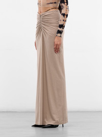 A ficelle linen-cotton maxi skirt with contrast g-string straps and gathered front zip detailing, blending structured tailoring with sensual cutouts. Featuring: • Slim fit • High waist • Contrast g-string straps at waist • Front zip closure with gathering • Maxi length • Made in China • Main: 71% Cotton 29% Hemp | Secondary: 92% Polyamide 8% Elastane • Standard sizing Model is 5'8" wearing size S. Bust: 32" Waist: 26" Hips: 34.5"