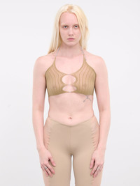 RUI tank in coffee, nylon knit construction, sheer, crystal pearls, beaded halterneck, sleeveless, open back, front & back keyhole cut-outs, straight hem, cropped length, slim fit. 92% Nylon 8% Spandex Numeric Sizing Model is 5'8" wearing size 1. Bust: 30" Waist: 24" Hips: 33.5"